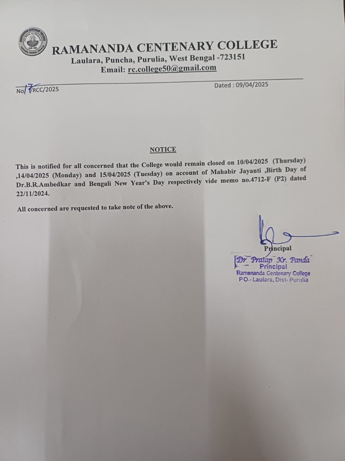 College will remain closed on 10.04.25, 14.04.25 and 15.04.25 on account of Mahavir Jayanti, Dr. Amb