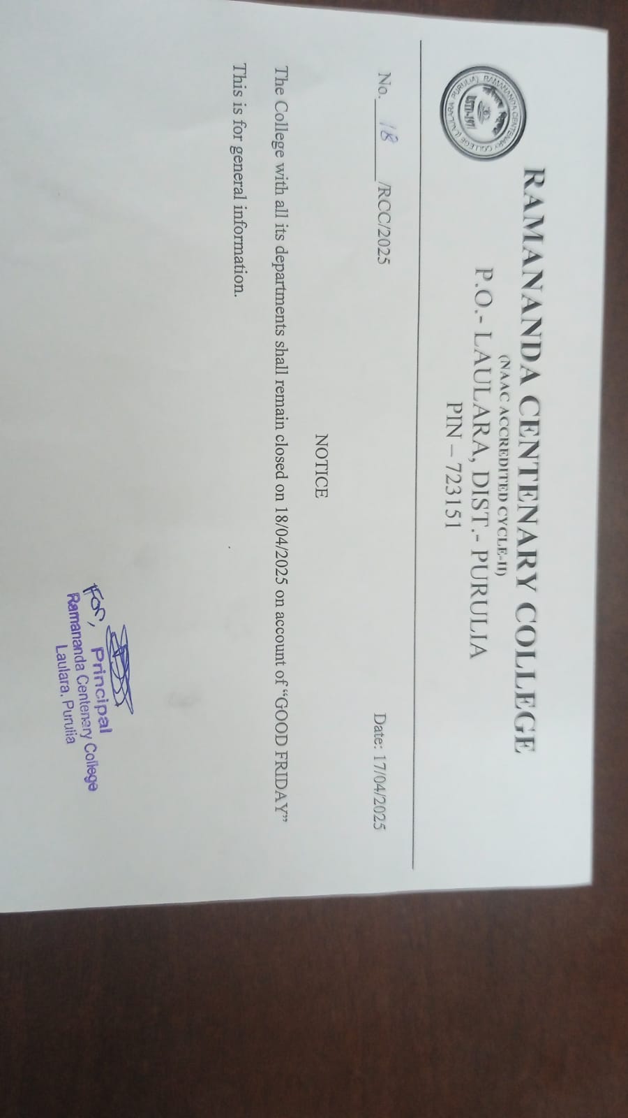 Holiday on 18.04.25 on account of Good Friday