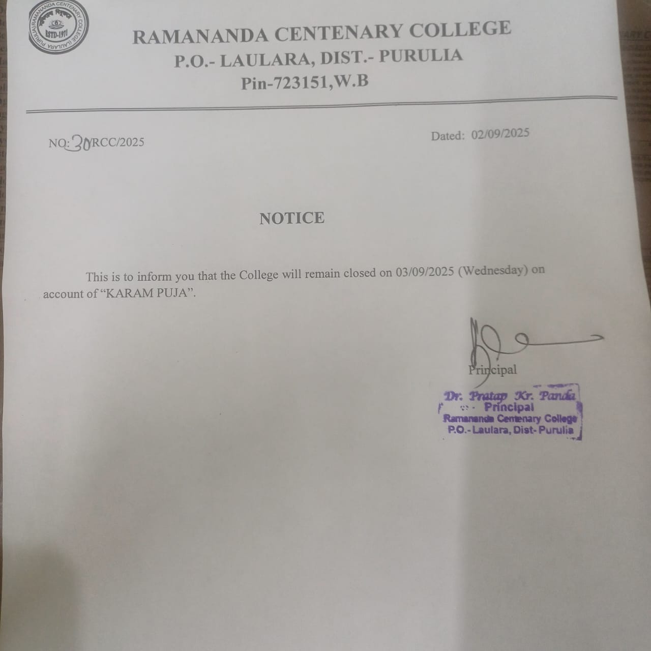 Holiday on 03.09.2025 (Wednesday) for KARAM PUJA